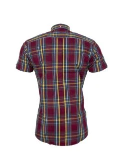 Men’s Burgundy, Yellow & Blue check shirt, complete with our iconic 3 finger summary down collar, full length back box pleat, V- Cut out on sleeve.