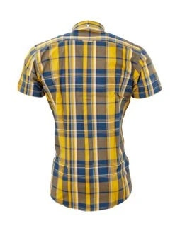 Men’s Mustard & Blue check shirt, complete with our iconic 3 finger summary down collar, full length back box pleat, V- Cut out on sleeve.