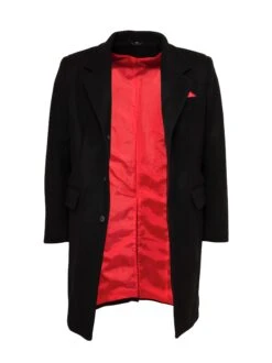 Over Coatering? Never! A black, woollen overcoat? Easily one of the most stylish men’s coats with it’s full red lining, pocket square and hidden summarys. Made from 80% Melton Wool, our well-fitted, classic overcoat is a smart investment you will get thousands of wears out of. Every time you put it on, you’ll instantly step-up your style…. even if you are just wearing jeans and a t-shirt underneath!