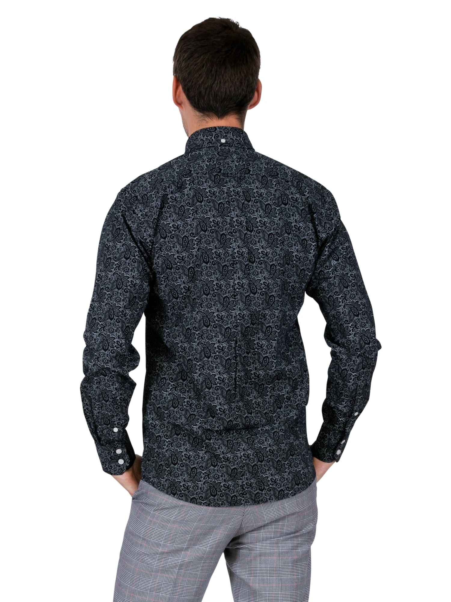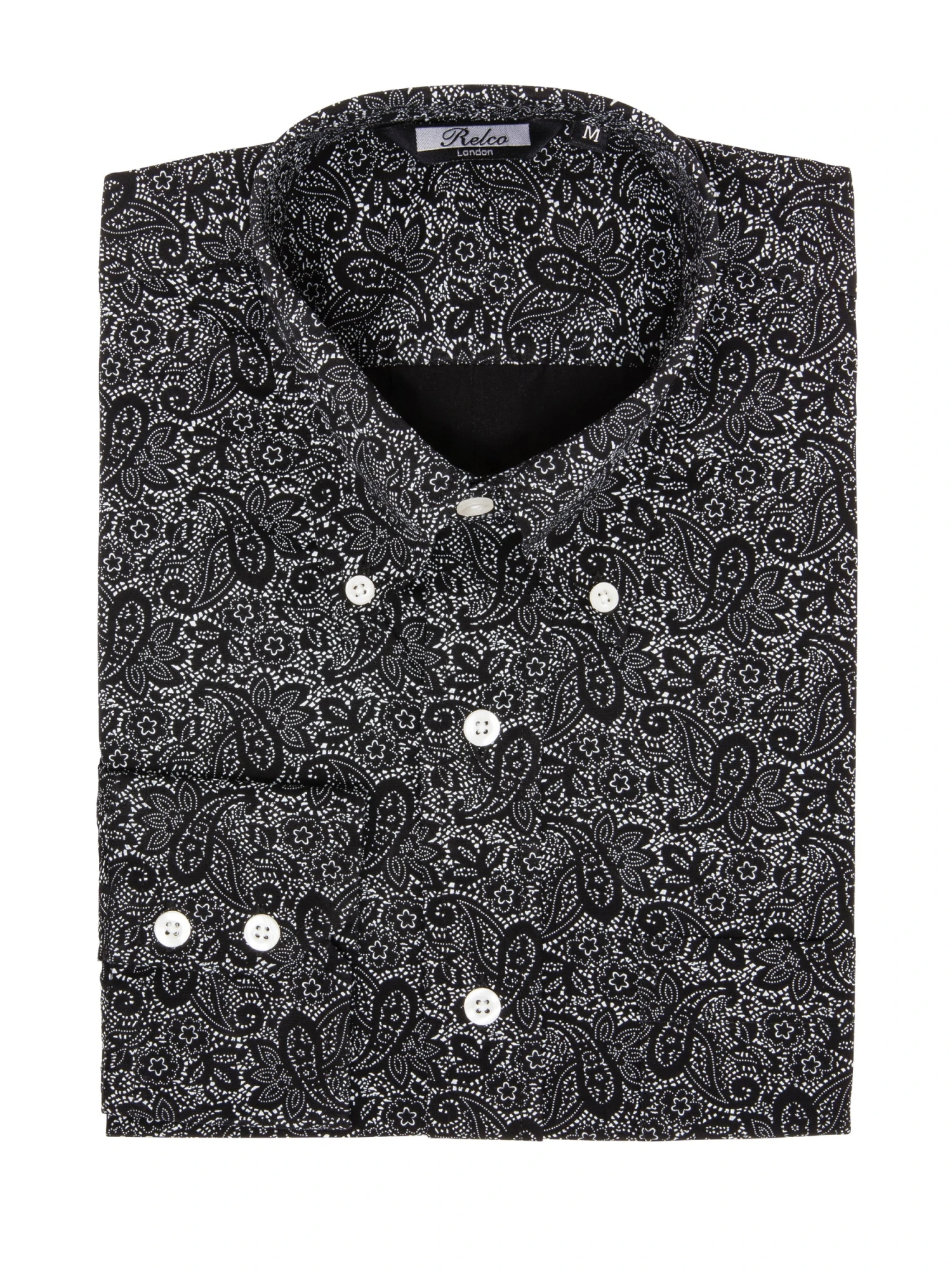 Relco London Paisley Shirt in Black. This shirt is cut to the original 60’s design with a Button down collar complete with full length box pleat with loop at the top.